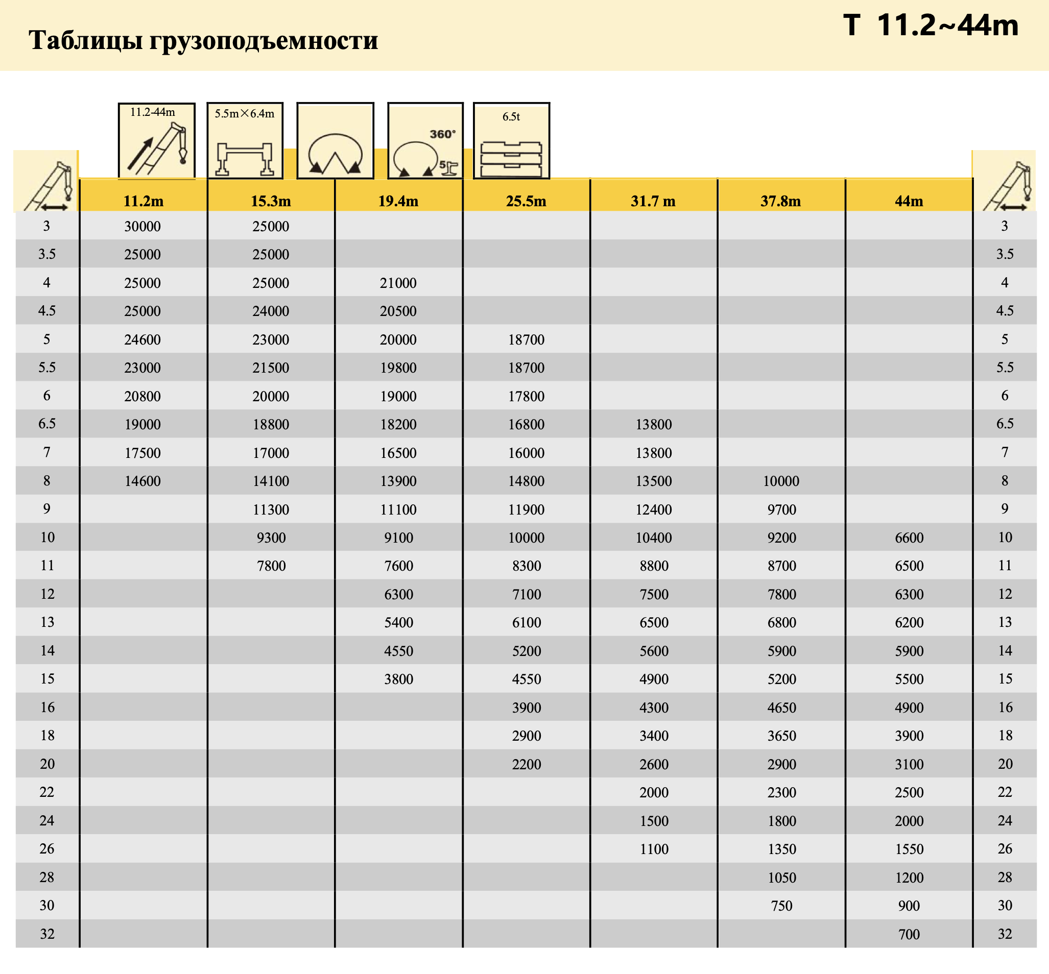 • Максимальная длинна стрелы(с гуськом) – 44+8,3 метра